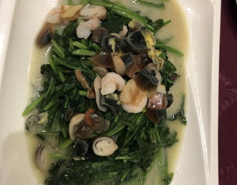 住在酒店,也不想跑出去找饭吃,正好中餐厅有团购的套餐,就团了个四人餐。冷菜是椒麻鸡和酱萝卜,鸡既不辣也不麻,料的味道也没进来,不太入味。元宝虾味道还不错,虾肉也有弹性,还是很清新的,炒墨鱼也很嫩很好吃。松菇豆腐吃上去糯糯的,面皮是煎过的,说不好是什么口味,但蛮入味的。牛柳粒其实挺嫩的,但真心不明白为何要烧到这样咸,酱汁浓到完全没办法入口,蛮失败的。蛋挞女儿很爱,炒菠菜也很细嫩,整体是一顿性价比还不错的晚饭。