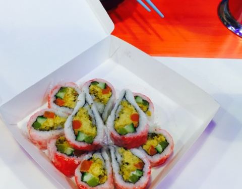 有时经过的时候突然像吃寿司了,围观了一下菜谱,感觉种类还挺多,决定试一试。点了一份樱花寿司,15元,一份蟹座什么寿司,15元,正好团两张12抵15元的现金券就够用了。外带的包装还可以,到家基本没问题。樱花寿司里面主要有肉松大根黄瓜,还有一种脆脆的东西不知道是啥,打包的时候我让师傅加了色拉酱,比较习惯这种吃法。蟹座寿司主要是蟹柳,还有一些基本配菜,只是上面白白的粉不知道是啥。总的说来口味还可以吧,价钱真的是公道的。