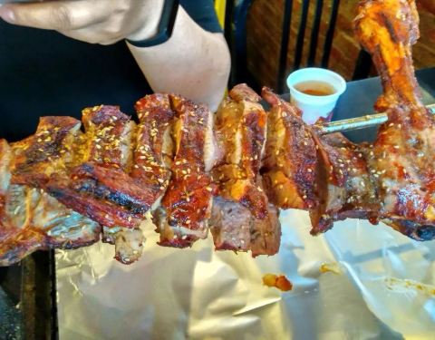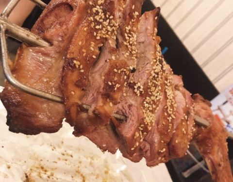 碳烤羊腿在在仙鹤门这边,出了地铁站走一会儿就能找到。店里不大不小有一些桌子,羊腿确实看起来很诱人,肉多多的。老板也热情的很呢