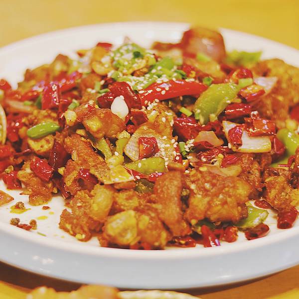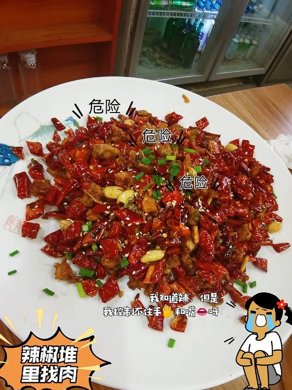 🌟辣子鸡:辣椒堆里找肉吃,鸡肉丁经过高温油炸后浓缩成金黄的小肉丁,考验眼力的时候到了。