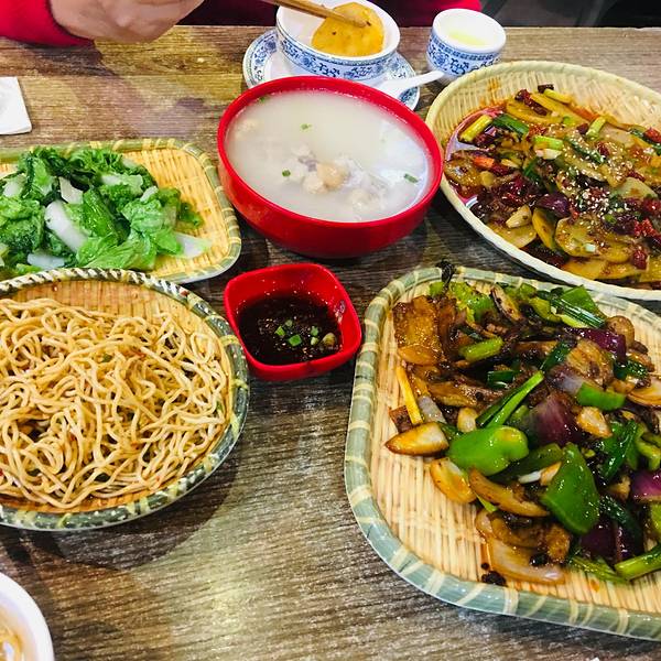 午餐时间点人非常多,还好有位置。三人餐包含一份凉面、一个回锅肉、一个干锅土豆片、一份素炒小白菜、一份蹄花汤,米饭管够。