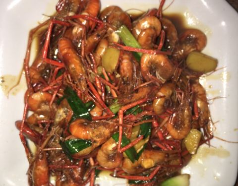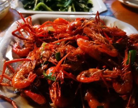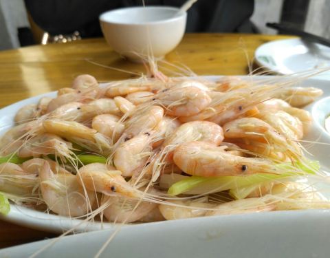 天不冷,露天吃的,实在不饿,就点了两个特色菜,上菜迅速,白鱼清蒸的,长长一条,盐水虾很新鲜,量很大,吃在嘴里还有甜甜的感觉
