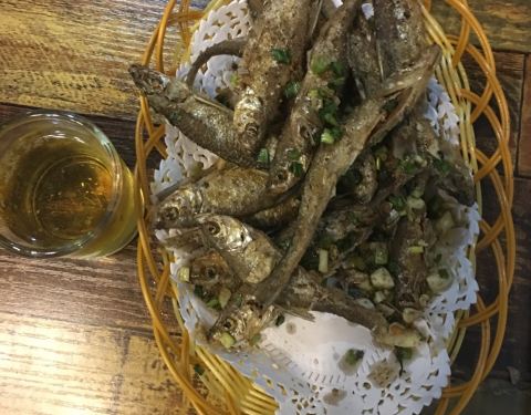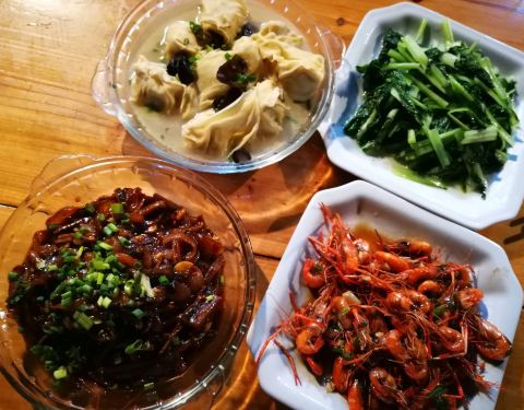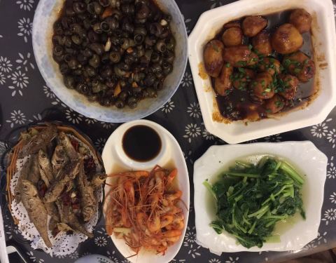 炸的小鱼,螺丝,芋艿,锦绣菜,虾都挺好吃的,两个大人一个小孩都吃光光