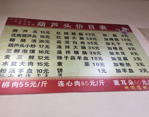 2018.05. 之前查到的葫芦头的照片, 由于是最爱的肥肠, 就认定一定要来吃吃, 这一家是离下榻酒店最近的一家店铺。 看评价不错, 上午就过来试试。 服务态度是很热情的, 端过来叮嘱两次记得搅一下盐在中间。 点了一份优质葫芦头加上一份精肠, 然后加了一个饼。 优质葫芦头的内容包含了花肠, 精肠,木耳,五花肉,粉丝,鹌鹑蛋, 还有过油豆腐,好像就是我们那边的香干吧。 进门一点单, 老板就问说是不是一个人, 我回答说一个人, 老板又问说,一个人? 我又答说一个人。 总体搞了三次才听清楚老板问我是不是要一个饼,也是尴尬了。 一个饼只要一块钱, 上来直接给我的, 让我觉得无处安放, 只好都先掰进碗里了不知道是不是这样。 这个饼好多粉子在表面, 手一摸粘了很多。 味道总体一般,要了特辣也不是很辣, 感觉就像是低配版的肥肠粉丝。 这个饼要了我的老命, 我觉得我掰得不算大,但是还是梗到, 可能是我技能太差。 加的十元肥肠很小一碟, 味道只能说可以吧, 粉丝也很少,过油豆腐比较多, 总体吃了二十八。 一个饼我实在是吃不完,导致好久才得以消化。 早知道不应该加这个饼会更好,而且总让我想起小时候我妈让我用隔夜硬馒头蘸火锅剩汤的感觉。