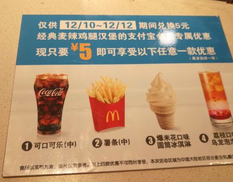 麦当劳这家店位于红山路边上,近红山动物园门口,旁边是南十里长沟主流,看现场路过这边,看到店门口贴的支付宝双十二的活动,辣堡领卷5元一个,就领了卷进去了。排在前面的姑娘也是参加这个活动,结果她是昨天领的没用,今天就过期了,收银时扫了卷还是收了12.5元,姑娘就不乐意了,收银员打算退现金给姑娘,但是大堂经理说退不了,需要电话联系支付宝这边的负责人,给了姑娘电话号码。但是听姑娘打电话,支付宝那边的负责人也解决不了,电话又转到大堂经理手上。。。后面就不晓得咋解决了。。。其实人家姑娘本来参加活动心情应该挺好的,经历这一遭估计要郁闷了。还记得大学时我哥带我去买笔记本,买完请我吃的汉堡和麦旋风