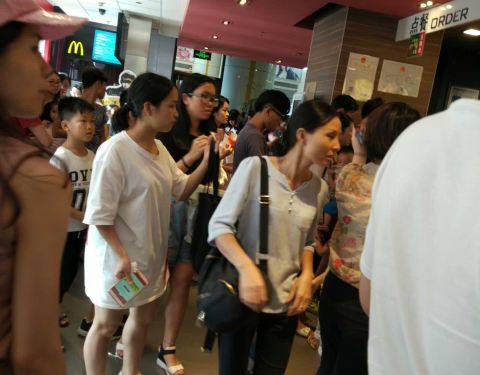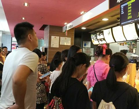 这家分店在市中心的新世纪广场内,不是得大,里面都挤满了客人。门口的甜品站更有一条长长的人龙,排队也需要10多分钟才可以点单。