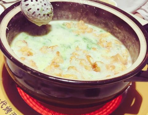 盆友推荐来吃的,就在酒店旁边,生意比较火爆,没想到在陕西这边喝粥的人也不少,大家都很注重养生哈,点了白粥锅底为了能尝到灰常期待的脆皖鱼??第一次吃实在很难想象鱼片煮过以后怎么能这么Q这么脆,嘎嘣脆,虽然外观和黑鱼片很像,why。不知道活的长神马样子,48一份略贵,虾滑和粥也很配哦,下饭不错很爽口也很可口,很养胃卡路里低养生必备。