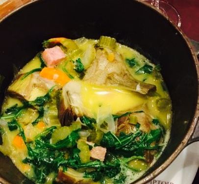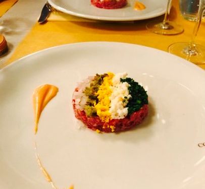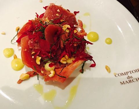 - 主菜点的有金枪鱼沙拉,还有洋蓟白酒,以及搭配喝酒吃的配菜,土豆加了牛肉酱特别好吃,还有调料,也很入味