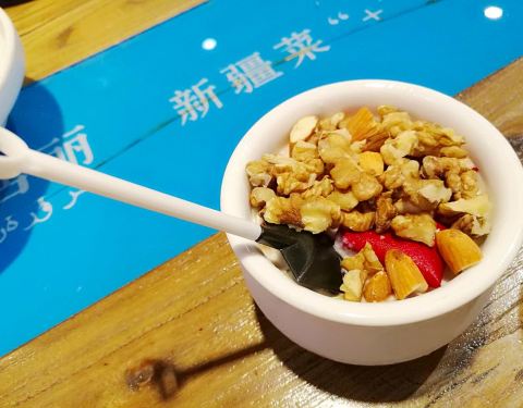 两个月来吃了四次,我肯定是真爱粉,撒了坚果的酸奶味道很棒,想吃土豪版的手抓饭没有,换成合拼的,烤肉味道不错,就是有点油,有的筋咬不动,同学还推荐了蓝莓山药,下次试。。。