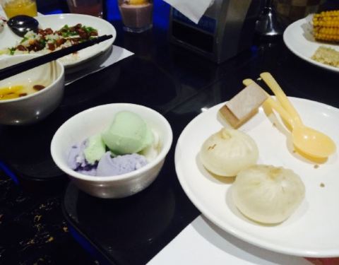 鲍鱼粥,烤肠,绿茶佛饼,小蛋糕,冰激凌……种类很多,每样东西尝一点点肚子就饱饱的了,服务员态度也很好