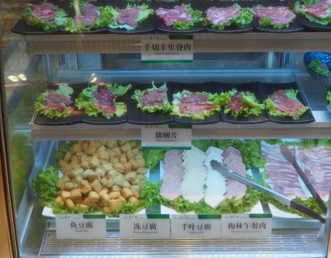 - 每人一个小火锅,食材自取。有牛肉片羊肉片,数十种鱼虾蟹贝,以及多种山野特色菜
