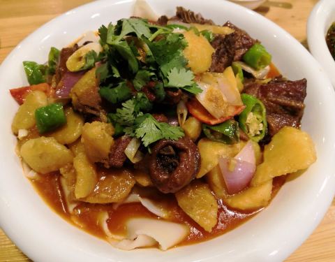 “西北大盘鸡”,经典的经典,量很大,鸡块和土豆炖得很可口,面条也很劲道!鲜肘肉也很滑嫩,很喜欢