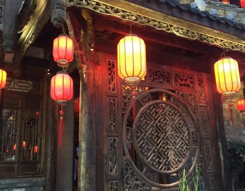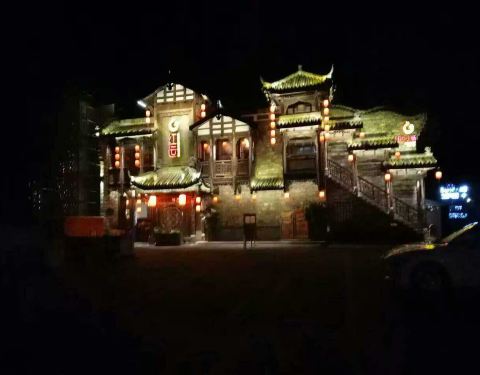 仿古建筑;红灯笼高挂;节目活动鲜颖;火锅红运冰豆爽爽