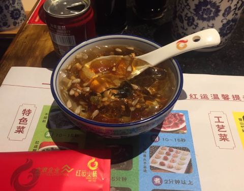 红运火锅(省体店) 一定要提前预约,因为人很多。 提前预约还有个好处就是可以预个好位置,可以看节目。 节目:琵琶演奏、传统乐器合奏、变脸、茶艺表演,还是很丰富不,所以切记提前订位。 关于停车: 位置多,就是停车费贵还没得免费,一小时五块,吃了二个小时五分钟 15元,这个银子花的有点心疼,下次骑共享单车去吃完散步回,坚持不开车,言外之意是我很满意还会再去。 环境:有点复古有点喜庆,一楼二楼三楼都有(三楼是包厢吧) 入座先给你来杯功夫凉茶,舒坦,等到你吃完火锅再喝这茶时才叫那个清爽,喝完把盖子打开服务员会自动给你添茶。 什么菜好吃呢?无非是常涮的,鸭血、萝卜、绣球菌、蔬菜、面条、腐Z、海带结等 牛肉、羊肉、黄喉、墨鱼滑等 外加一份油条,嘿还真不错!