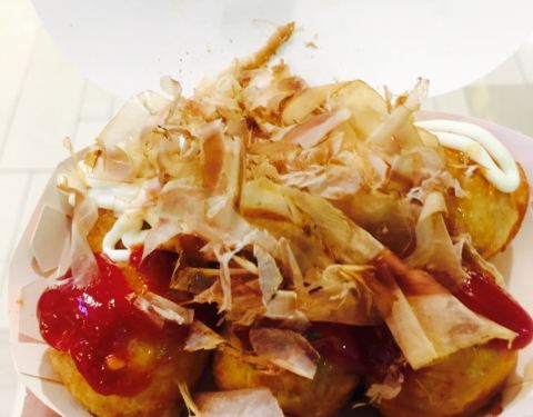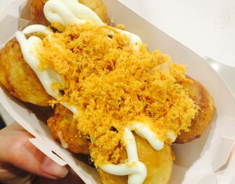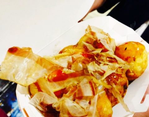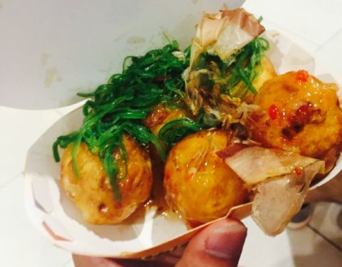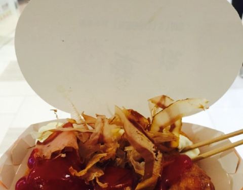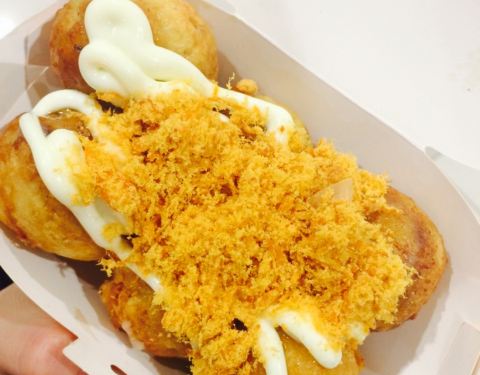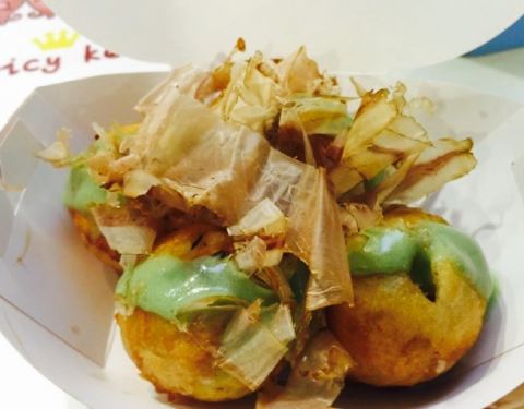 是一个不大的档口,不过生意火爆,总是排队。我每次去都要次,实际上是我老公爱吃,一到地下一层就能闻着味道找到他家了,哈哈。吃货的世界不必解释。出了新品种超级章鱼小丸子,有整只的小??在里面,果断超级呀,15RMB一份,比普通大份贵五块,可是量是小份的四只。WAT,我郁闷,不过丸子很大只,因为整只墨鱼仔在里面嘛。还是甜辣和辣海带的双拼,但是这个辣海带还加了沙拉酱。什么鬼,讨厌沙拉酱一万年。以后还是老实吃普通大份吧。哼。请给我单纯的辣海带。