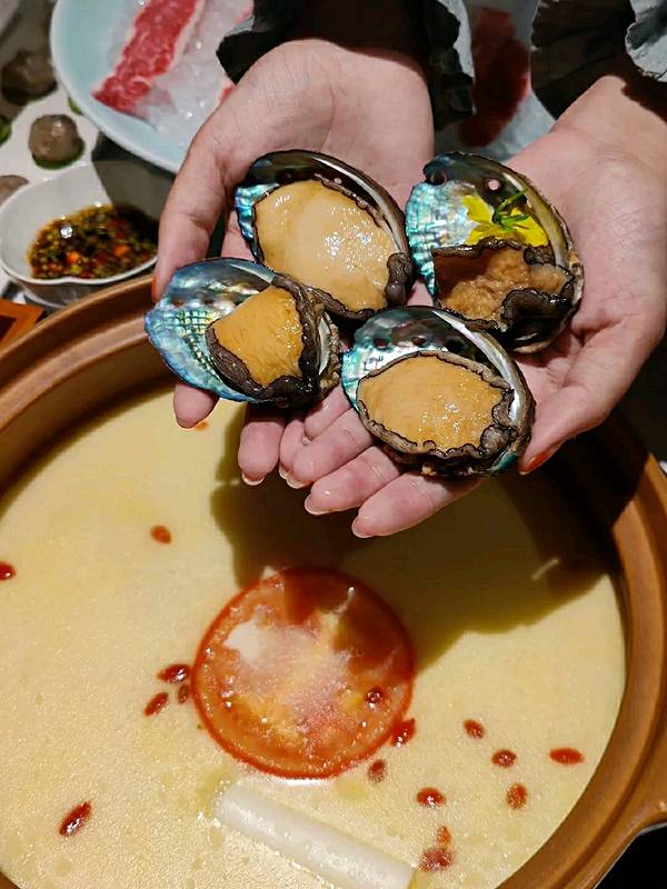 银滩鲍鱼的装修总是给人一种一言难尽之感。虽然小伙伴说这里已经是新装修过的了,但还是觉得与“高端”、“雅致”有一定距离。包括菜品的摆盘也是如此,各种元素强行堆积,让人忍俊不禁。[笑哭][奸笑][吐舌] 服务也很迷,上菜完全没有章法,荤素菜混在一起上,谁先出来谁先上。凉菜和需要烫的菜也放在一起,也没有提示。上位菜就更神奇了,居然直接堆在中间的转盘上,两次都是。问:锅底有选择吗?服务员答,这是我们的招牌锅底。问:火力怎么调节?答:火就是那样。[晕][擦汗][笑哭][懵逼][呵呵] 锅底要表扬,不愧为招牌。汤味浓郁,而且能感觉到汤味的鲜美。而且下午也没有明显口干的感觉。就是表面太容易积泡沫和难看的一层“皮”。服务员处理之后,几分钟就恢复原状了。 菜品中的海鲜品质参差不齐,基围虾虽然比较新鲜,但是虾头和虾身上有奇怪的黑色污渍,不好评价。鲍鱼是处理过的,吃起来很方便,不错。刺身拼盘中的三文鱼肉质稍微有点偏散。松茸捞饭的底汤太浓了,太腻了,居然没有配红醋,后来要了一碟红错加进去才吃下去。凉菜中的【潮式酱鸭】是我心中的全场最佳,越嚼越香。 12元的茶位费,12元的味碟,这样的定价还是能从某个层面体现出商户的高端。不过,每次都是我自己站起来倒茶、只是简单的海鲜酱油加一点调料的味碟,相比较现在层出不穷的各种汤锅品牌,如果是我自己来消费,我会觉得很冤。