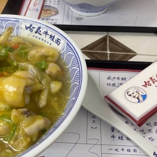 被安利哈灵面馆的牛蛙面之后,我就被深深的吸引,时不时的就想来一碗,不在乎在哪里,只要有哈灵面馆的连锁门店,我都想吃。 【牛蛙面】 据说每一碗都有两只牛蛙的量,味道以香、鲜为主,之后舌尖上会有些辣辣的...被安利哈灵面馆的牛蛙面之后,我就被深深的吸引,时不时的就想来一碗,不在乎在哪里,只要有哈灵面馆的连锁门店,我都想吃。 【牛蛙面】 据说每一碗都有两只牛蛙的量,味道以香、鲜为主,之后舌尖上会有些辣辣的感觉,这淡淡的辣味很勾引人的,一口接一口,吸溜吸溜地不知不觉就光盆了。 面很劲道,也很入味,感觉面里面也有了汤汁的鲜味。我更倾向面条。