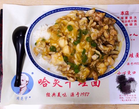 时隔多年 又吃到了好吃的牛蛙面 哈灵现在分店越开越多 不局限某个区域了 有吃过另外几家牛蛙面的 还属哈灵在心中的地位最高 不曾想牛蛙面也快吃不起了 原价一份居然高达69元 索性门店有优惠 加之点评团购 性价比顿时高不少 以前的牛蛙面只有面 现在还提供米饭 真真是极好的 宛平南路这家也是常年排队哦 人气旺的不要不要 等面蛮久的 米饭相对快些 牛蛙量依旧大 有了青辣椒会有微微的辣度 勾芡调味佳 蛙肉入味带有甜度 酱汁更渗透米饭 面条也不逊色 久煮不烂富有嚼劲 外加一块炸猪排 老上海酱油蘸蘸 可以说很满足了 别说一整份 女生吃不完 就是光吃牛蛙 都能吃上好久 粗略算了下 点单等单吃完 估计得花1个小时