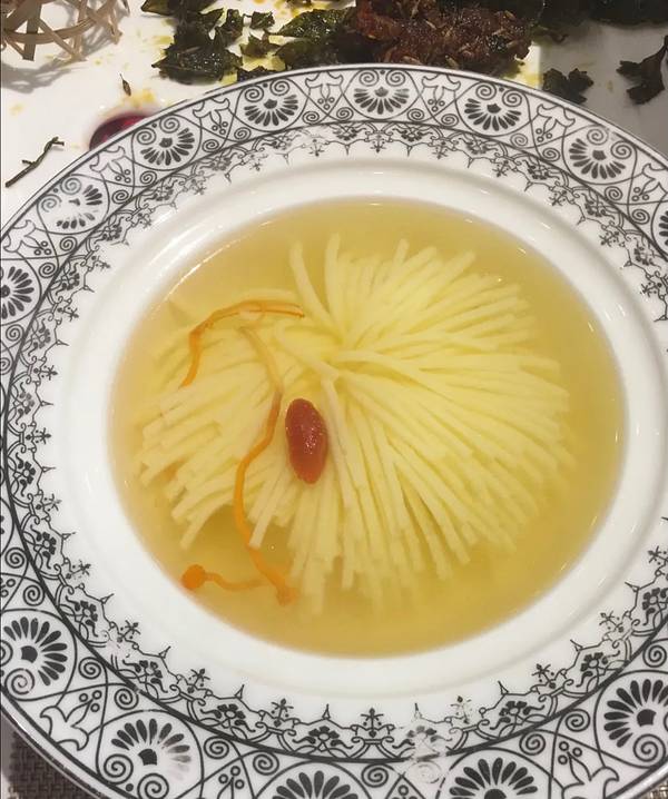 新开不久的食堂,餐厅总体环境比较优雅清静,尤其是豪包,请朋友吃个饭,谈个事儿有里有面儿。开餐之前,可以在边上的榻上小酌几杯茶水,很是舒服。房间顶上贴的是纯金箔。木榻上的山水出自中国书画院院长,听盯...