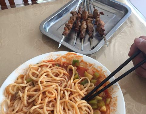 家门口的兰州拉面,味道不错,常来吃,今天拉条子,烤串