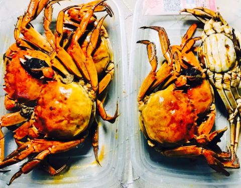 一份大概三头蟹,打包盒装得满满当当,用来佐酒真不错。螃蟹对剖开,可以见到里面的籽,汤汁浸着滋味很浓厚