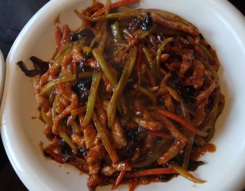 公司对面开的餐厅,人气还不错,跟同事中午一起约的聚餐,上菜还蛮快的,三个人点了三个菜没吃完,人均20多,味道中规中据,炒凉粉很好吃稍微有点油大,鱼香肉丝很好下饭菜,过把瘾点的有点失败,辣椒炒茄子为毛...