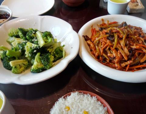 炒凉粉很好吃稍微有点油大,鱼香肉丝很好下饭菜,过把瘾点的有点失败,辣椒炒茄子为毛还要放西红柿,...