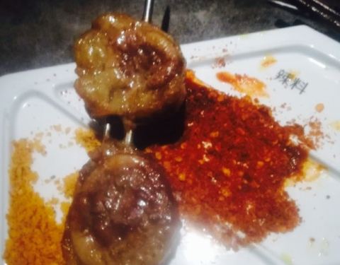 - 撒上特制的佐料,口感细嫩,良心羊肉串。比炒饭好吃。但是这条街全是吃饭的地方,导致排队停车有点慢。没错