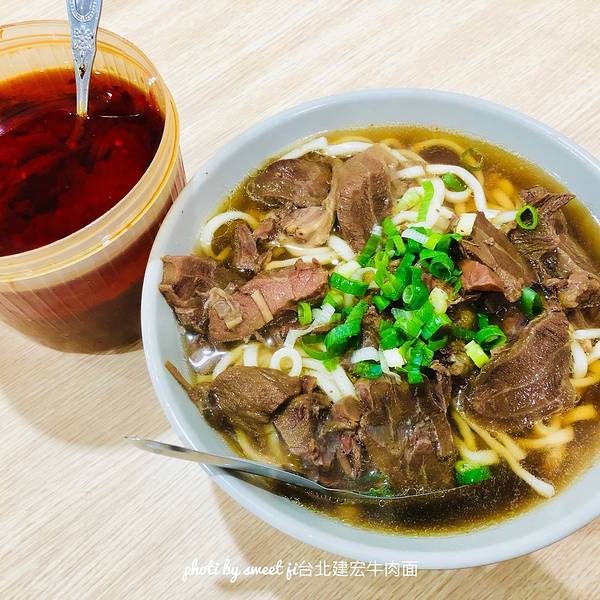 牛肉麵一直都是台北具有代表性的特色美食,更特別的是,在台灣似乎沒有所謂正統的牛肉麵,每一家麵店根據老闆的巧思與堅持展現相當多元的面貌。而建宏就彷彿是在一片油膩紅燒風味牛肉麵中的一道清流,又有別於強...牛肉麵一直都是台北具有代表性的特色美食,更特別的是,在台灣似乎沒有所謂正統的牛肉麵,每一家麵店根據老闆的巧思與堅持展現相當多元的面貌。而建宏就彷彿是在一片油膩紅燒風味牛肉麵中的一道清流,又有別於強調藥膳風味或者清燉風味的非傳統牛肉麵,建宏用充滿鮮味的牛肉醬油湯汁與大小適中的軟嫩牛肉塊搭配軟硬適中的圓粗麵條在保有紅燒風味的同時讓整碗麵保有清爽的口感