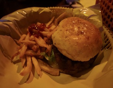 这是一家很高档的西餐厅,在周围的地区非常的有人气,夜晚餐厅的灯光比较暗显得很昏黄因此看起来非常的温馨,我们点了当天餐厅特价的牛肉汉堡,非常的大而且很好吃,一定要赞一个