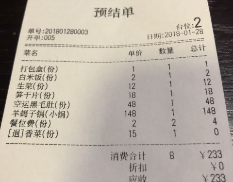 周末中午冰天雪地想吃点补补身子,在巴黎春天转了半天最后选了这家羊肉火锅店。由于我们只有两个人,所以点的不多,一份中份的羊蝎子火锅,份量不小,两个人吃最后还剩四块实在吃不下了,打包回家。羊蝎子上的肉不多但挺有劲道的,比较新鲜。另外还点了一份笋干,一份毛肚和一份生菜,共233元。中午人很少,只有两三桌,服务尚好。