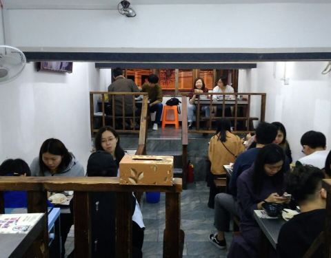 【店很小,人很多。】 排队时间:10月3日下午大概两点半;排队时长:大概半小时。 以前觉得香港的小吃店很“麻雀”。看了上海的发现其实也差不多。寸金尺土啊!加上高峰时要排队,座位更紧张了。但实话说很值得。 ...【店很小,人很多。】 排队时间:10月3日下午大概两点半;排队时长:大概半小时。 以前觉得香港的小吃店很“麻雀”。看了上海的发现其实也差不多。寸金尺土啊!加上高峰时要排队,座位更紧张了。但实话说很值得。 【牛蛙面,超好吃。】 味道正 出乎意料的好吃!面条️韧性,筋斗,牛蛙肌肉感,不肥腻,有点甜有点咸有点青椒带点微辣,丰富的口感,极刺激味蕾。本猫好喜欢的说!!!吃完感觉我要辜负“云吞面”了。 份量大 不是碗大汤多的虚张声势,牛蛙跟面条都很多。正如门口电视所说“性价比极高”啊!!!隆重推荐给男士们去吃,女士脸皮要够厚,两个人点一份,否则吃不完。当时我是处于饥饿状态,抱着不浪费粮食的心态,当午餐晚餐一齐吃,S撑吃完的。 【望山楂气泡水,很特别】 第一次喝味道这么特别的“汽水”真是够新奇! 酸酸甜甜解渴又解辣,只是搭配大碗面后觉得更饱了。