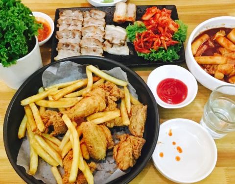 叫的外卖,本来期待不大的,没想到水准很高。炸鸡一半一半,原味的比较可口,虽说是外卖依然有不错的脆度。咬下去鸡汁溢出很不错。搭配的萝卜泡菜很可口。包猪肉正餐价廉物美,肥而不腻,配搭的蘸酱很地道,自家...叫的外卖,本来期待不大的,没想到水准很高。炸鸡一半一半,原味的比较可口,虽说是外卖依然有不错的脆度。咬下去鸡汁溢出很不错。搭配的萝卜泡菜很可口。包猪肉正餐价廉物美,肥而不腻,配搭的蘸酱很地道,自家的泡菜也是水平很高。泡菜汤辣的很舒服,不过不会太超过。只有海鲜年糕可能因为是外卖,稍稍有些腥了。