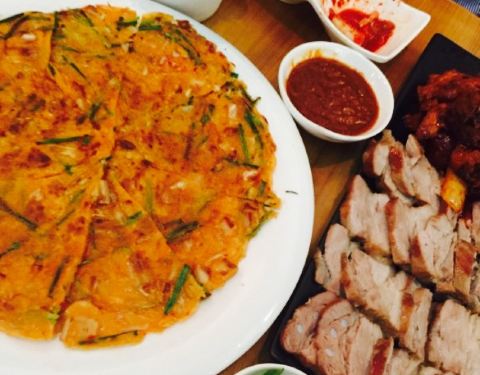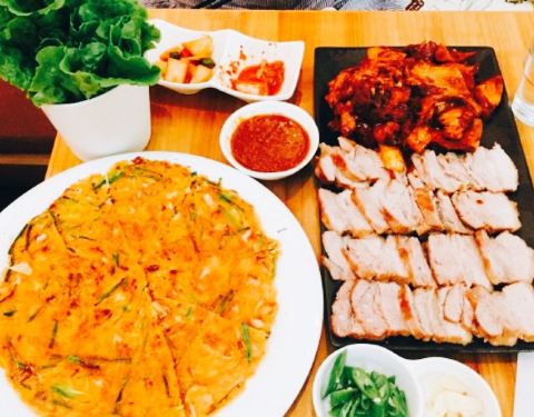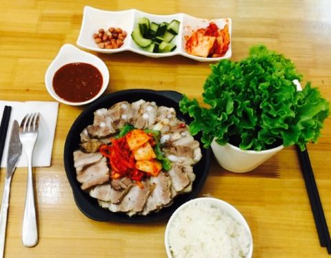 团了2人餐,店的位置比较偏,之所以找起来没费多大事,是因为以前上学的时候来过这条路,这条路上都是各种韩式的小店。7点左右到店里没什么人,8点开始人多起来了快坐满了,不少都是韩国人,看来韩国人吃晚饭的时间和我们有点不一样。老板娘是韩国人,味道应该算正宗了,菜式和外面一堆一堆的的韩式店不太一样,有些菜式之前都没在其他韩式店见过。室内布置也不错,小不过很精美。包猪肉,肉应该是煮出去的,肉片很厚,很嫩,不腻,生菜包着吃。以前都是烤肉包着吃,这样吃是第一次,觉得味道不错。芝士猪排,好大一块猪排,比脸大,芝士也很足,很适合肉食动物。金枪鱼色拉,好大一盆,真实惠,味道还行。米酒,我和女朋友都是不喜欢喝酒的,不过这个米酒可以喝好几杯,味道有点像果汁,没喝完还打包了,哈哈哈。海鲜葱饼,这个是后来单点的,没吃完打包了,觉得有点咸,味道一般了,没有上面的几道菜有特点。开胃下饭,这个值得一说,因为以前吃韩式的开胃下饭都太酸,觉得都是做了很久放酸的,只是这里是新做的。总而言之,很不错的一家小店,下次还会考虑再来的。
