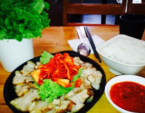 团了2人餐,店的位置比较偏,之所以找起来没费多大事,是因为以前上学的时候来过这条路,这条路上都是各种韩式的小店。7点左右到店里没什么人,8点开始人多起来了快坐满了,不少都是韩国人,看来韩国人吃晚饭的时间和...团了2人餐,店的位置比较偏,之所以找起来没费多大事,是因为以前上学的时候来过这条路,这条路上都是各种韩式的小店。7点左右到店里没什么人,8点开始人多起来了快坐满了,不少都是韩国人,看来韩国人吃晚饭的时间和我们有点不一样。老板娘是韩国人,味道应该算正宗了,菜式和外面一堆一堆的的韩式店不太一样,有些菜式之前都没在其他韩式店见过。室内布置也不错,小不过很精美。包猪肉,肉应该是煮出去的,肉片很厚,很嫩,不腻,生菜包着吃。以前都是烤肉包着吃,这样吃是第一次,觉得味道不错。芝士猪排,好大一块猪排,比脸大,芝士也很足,很适合肉食动物。金枪鱼色拉,好大一盆,真实惠,味道还行。米酒,我和女朋友都是不喜欢喝酒的,不过这个米酒可以喝好几杯,味道有点像果汁,没喝完还打包了,哈哈哈。海鲜葱饼,这个是后来单点的,没吃完打包了,觉得有点咸,味道一般了,没有上面的几道菜有特点。开胃下饭,这个值得一说,因为以前吃韩式的开胃下饭都太酸,觉得都是做了很久放酸的,只是这里是新做的。总而言之,很不错的一家小店,下次还会考虑再来的。