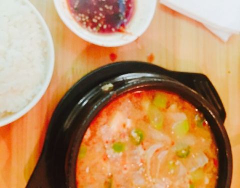一进门就有香香的味道,因为是工作日中午又去的早的原因吧,一开始包场了。点了炸鸡(最爱酱味韩式炸鸡。分量多,吃不完打包走的)。部队汤(部队锅是一大锅,部队汤是一人份,这点很好,解决了我又想吃部队锅,...一进门就有香香的味道,因为是工作日中午又去的早的原因吧,一开始包场了。点了炸鸡(最爱酱味韩式炸鸡。分量多,吃不完打包走的)。部队汤(部队锅是一大锅,部队汤是一人份,这点很好,解决了我又想吃部队锅,又吃不掉的尴尬,部队汤味儿很足。)。炒章鱼(里面是加酒了吧,不是非常喜欢)。牛肉炒饭(太美味啦。咸度适中。根本停不下来。这个实在超级推荐。)。