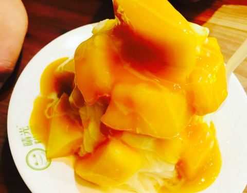 一直想尝尝“绵绵冰”,因此选择了晴光粉圆点抹茶绵绵冰。之前在别的地方吃红豆牛奶冰时踩过雷,一大盘冰只有表层覆盖一层红豆和炼乳,底下全部是实打实的冰坨子。但这边的绵绵冰是把一大坨抹茶味道的冰淇淋片成一片片然后堆叠起来,抹茶味道清新 。奶味比较浓厚,红豆打底,配有些许奶冻,我和伙伴都感觉味道不错。