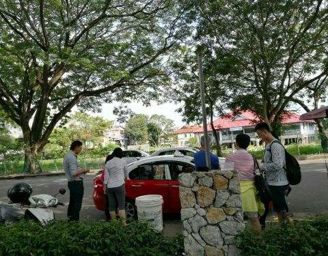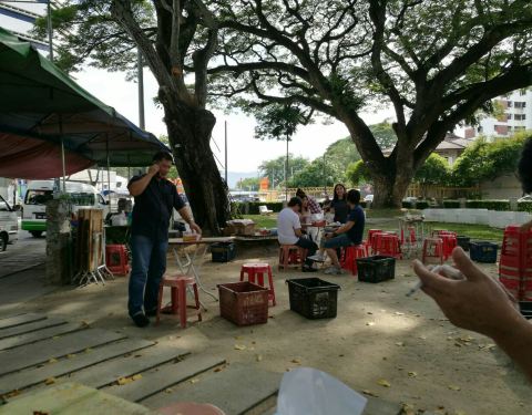 龙哥榴莲就在乔治市Anson Road路边摆卖,据说已有30年历史,有经营牌照的。这里的榴莲品种多样,以质取胜,有红虾、葫芦、坤保红肉等冠军品种,口味不同于泰国榴莲,醇香钟带甘,令人回味。正因如此,吸引了一众榴莲吃货,不仅是当地人,远方来客甚至港台一带的知名人士也慕名而来,名声在外。人们便在大树底下一处宽阔的休憩地,休闲地围坐桌子旁边吃边聊。