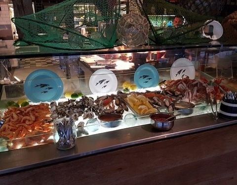 这家餐厅很舒适,价格很合理。海鲜的选择牡蛎和对虾是非常新鲜的,煮熟的贻贝和鲑鱼是非常好吃的。一些热土的选择,沙拉也是新鲜的。我们还提供烤牛排作为自助餐的一部分,那太好了。饮料价格也很真实,很合理。如果你喜欢牡蛎、对虾或色拉加一些酒,这家餐馆是不错的选择。