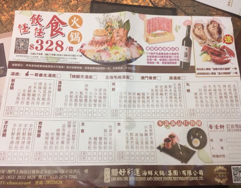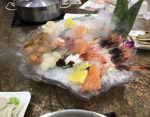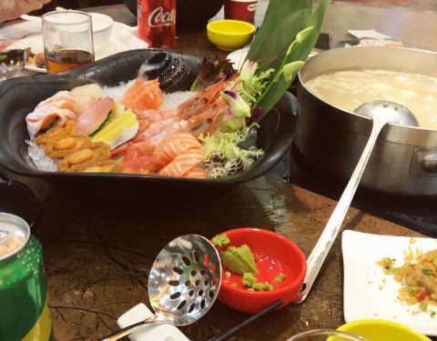 自助火锅328/位。各类刺身、肉、海鲜、青菜、主食,品种挺全的,食材也挺新鲜的。大晚上的吃自助真是罪过!不要嫌弃虾为什么小的像基围虾,大的那是单点的。哈哈。人家服务员就是爱说实话!对了这里面的大油条挺好吃的。