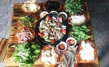 ...8双人餐很划算,腊排骨中锅,菜任选五份,两个人吃的饱饱的,排骨味道挺不错的,蘸料好吃,推荐一下