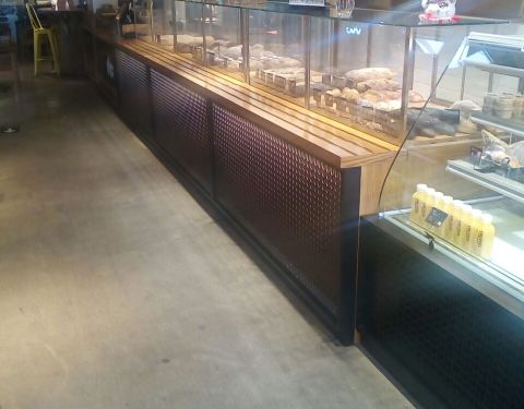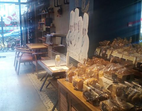 1)店面位置:八佰伴店位于南泉北路靠近商城里苏宁易购一楼外侧旁边。 2)店面特色:法国天然的红酒酵母技术与烘焙酵术结合,专注于做天然面包。水碱面包、面包圈和大列巴相对比较受欢迎。 面包个头都比较大,韧性十足,比较有嚼劲,用料也比较天然健康,含坚果谷物也比较多,很容易有腹饱感。买单后可要求店员帮忙分割切片便于快捷食用。 3)店面环境:黑底白字的法式乡村自然系的装修风格,暖黄色的灯光下的干净透明的大玻璃橱窗里陈列着硬欧包、软欧包、吐司和甜点等各类品种面包。 有蛋糕冷藏柜、吐司面包区、用餐区和面包展示售卖区等的隔断。 店里有堂食区,户外有露天座位,室内有几个木制桌椅和高脚吧台桌椅,可以吃点面包小憩片刻。 4)用餐体验:点单后,服务生出单和打包速度较快。 22元一个的全麦金枪鱼三明治是已经做好的现成品,从冷藏柜里拿出的。面包片能吃出麦香味,金枪鱼料稍微少些,味道中规中矩。 7元一袋的咔咔脆类似面包干,口味自然,谷香浓郁,要起来确实有咔咔脆的声音。 18 元一大杯的霸气橙子是现做的,橙子切片比较多,橙子味比较自然,但为提鲜所添加的冷链果汁偏甜。 5)价格:相对85度C等高些,但胜在面包大多是现场新鲜烘培出炉,且口感自然。