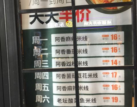 - 多种口味可供选择,周一到周日每天一款特价,每一款米线可免费加一碗米线,对食量大的朋友来说特划算