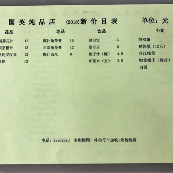 国英炖品店,这家是当地比较出名的老字号甜品店,店面很小,环境服务其实都很一般,但是这边的炖品真的味道很不错,龟苓膏味道也很赞。
