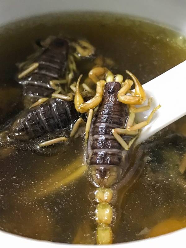 党参、乌鸡和半打蝎子是主材料,辅料还有龙眼肉等一起煲汤,先拿小碗喝汤,柔和中带有药材和微甜的口感