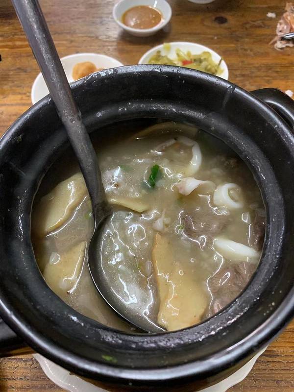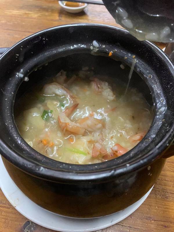 与潮汕牛肉火锅齐名的就得数潮汕砂锅粥了,到了潮汕怎能不尝一下。 这家远离游客众多的区域,以本地客人为主,没有豪华的装修,干净整洁,典型的大排档的风格。 四个人要了两锅粥:虾蟹粥和鸽子拼鱿鱼粥,分量正好。20分钟上桌,对于现做来说,已经很快了。对于我们这样的来自内地的人,虾蟹很难吃到新鲜的,来潮州吃砂锅粥冲的就是食材的这股新鲜劲。第一口吃下去就感觉果然没有让我们失望,虾蟹非常新鲜,带甜味,熬煮出来的粥怎一个鲜字了得。 鸽子拼鱿鱼粥也很不错,是另外的一种鲜味,两者用料都挺足的,粥的咸淡合适。如果觉得不够咸味,还可以蘸附赠的黄豆酱,提鲜增咸。 两锅吃下来不到200,人均50不到,性价比太高了。