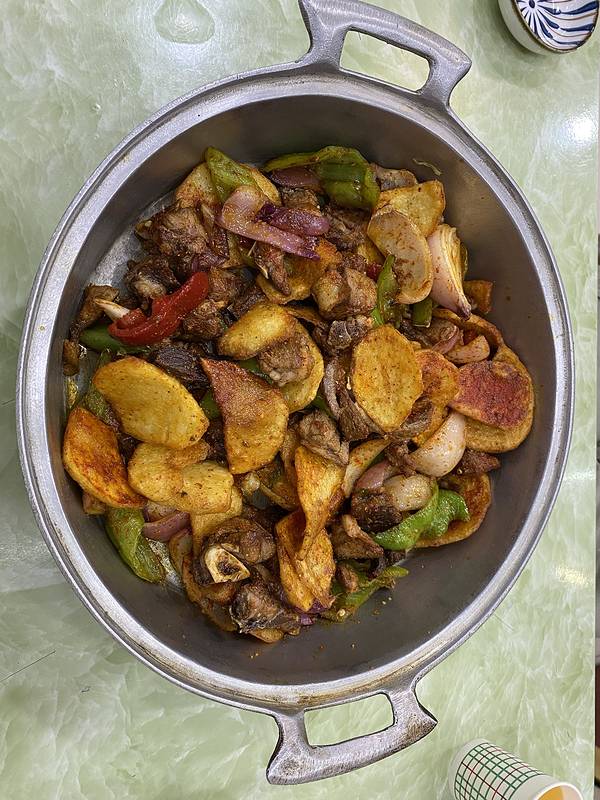 好吃的土豆片羊肉也香,就是有点咸,因为个人口味清淡,吃完会上火。 - 生意在饭点的时候是不错的,路过的行人也会停下来买一份吃吃的… 尝试着像当地人一样买了一份烤羊腿...