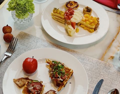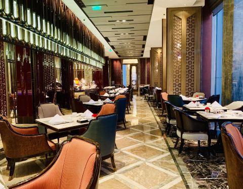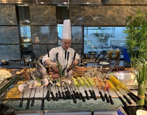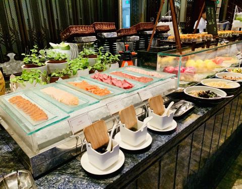 餐厅宽敞雅致,提供种类多样的自助餐品。这里菜品丰富,甜品、海鲜、烧烤等应有尽有。甜品台彰显细致和用心…