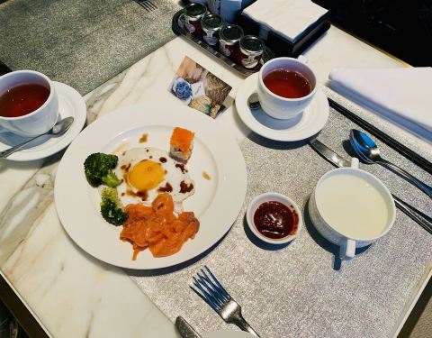 在万达瑞华41层的美食汇用的自助早餐,工作原因去的时间比较早,在东边一侧的落地窗,居然看到了日出,很欣喜。自助早餐的餐厅味道很不错,牛肉面里面的牛肉味道很香,就是牛肉块稍微少了一些。新鲜炸出的果汁,比如香瓜汁非常好喝。服务生收拾餐盘也很勤快。