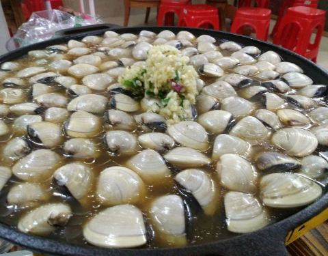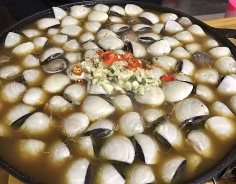 店铺生意很好,晚上需要等位。第一次这么吃贝壳类,混着蒜香味非常鲜美,吃完可以涮菜